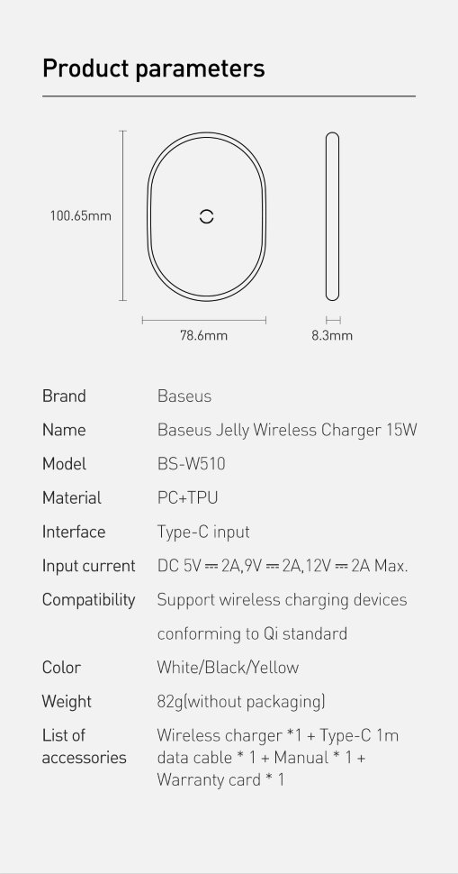 • Высокофункциональное зарядное устройство от компании Baseus мощностью до 15 Вт. С его помощью вы сможете быстро подзарядить свой гаджет с функцией беспроводной зарядки. Достаточно лишь поместить смартфон на поверхность зарядного аксессуара